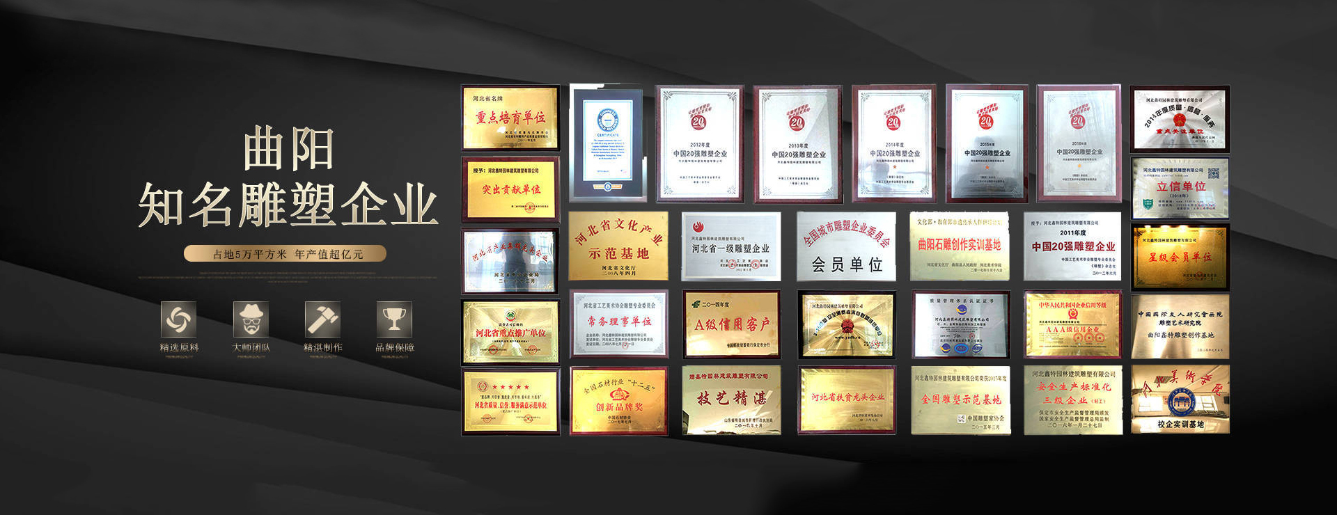 河北鑫特園林建筑雕塑有限公司成立于2002年,是中國雕刻之鄉(xiāng)——曲陽縣的一家實(shí)力雄厚的大型雕塑公司,公司占地面積50000+平方米,年產(chǎn)值超過億元,具有雕塑總承包一級(jí)資質(zhì)、古建筑三級(jí)資質(zhì)、市政公用工程施工總承包三級(jí)資質(zhì)。